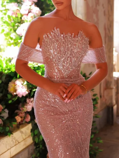 $643.17Pink Sequin Beaded Off-Shoulder High Slit Fishtail Evening Dress for Prom Gala