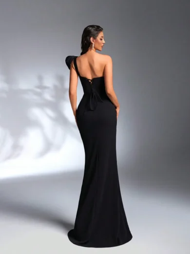 $842.52 – $955.74Price range: $842.52 through $955.74Black One-Shoulder Mermaid Gown with Ruffle Detail and High Slit, Elegant Evening Dress for Formal Events
