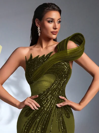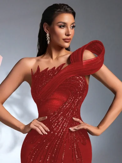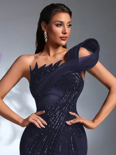 This elegant black evening gown features a one-shoulder silhouette with dramatic pleated detailing and all-over beaded sequin embellishment. The form-fitting cut highlights the waist and curves, while the floor-length hem adds sophistication. Perfect for formal events, weddings, or upscale parties, it combines modern structure with glamorous sparkle.