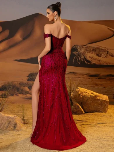 Sparkly Off Shoulder Mermaid Evening Dress with High Slit for Prom & Formal Parties