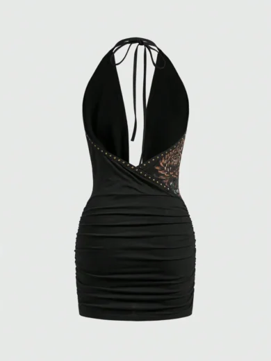 Sexy Tattoo Print Plunging Halter Neck Ruched Mini Dress for Women