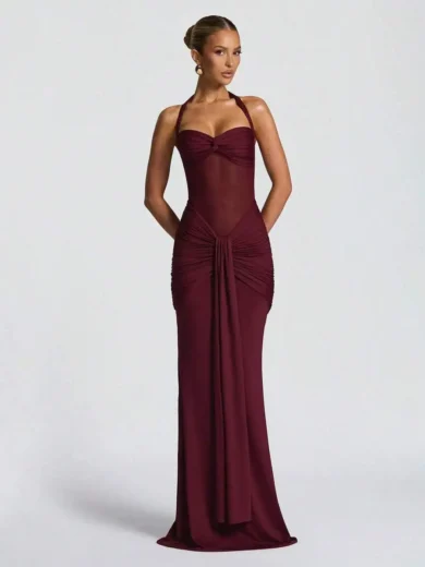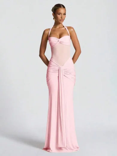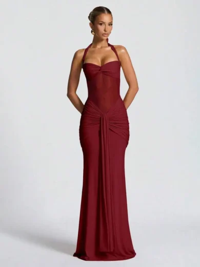 This elegant yellow maxi dress features a halter neckline, a twist-front bodice, and a ruched waist that accentuates the silhouette. The sheer panel adds a touch of allure while maintaining sophistication. Designed to flow gracefully to the floor, it’s perfect for evening parties, beach vacations, or any special occasion where you want to make a statement.