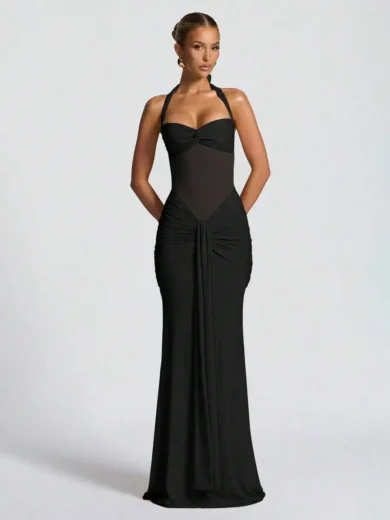Be the first to review “Yellow Halter Neck Ruched Maxi Dress with Twist Front and Sheer Panel for Party or Vacation”